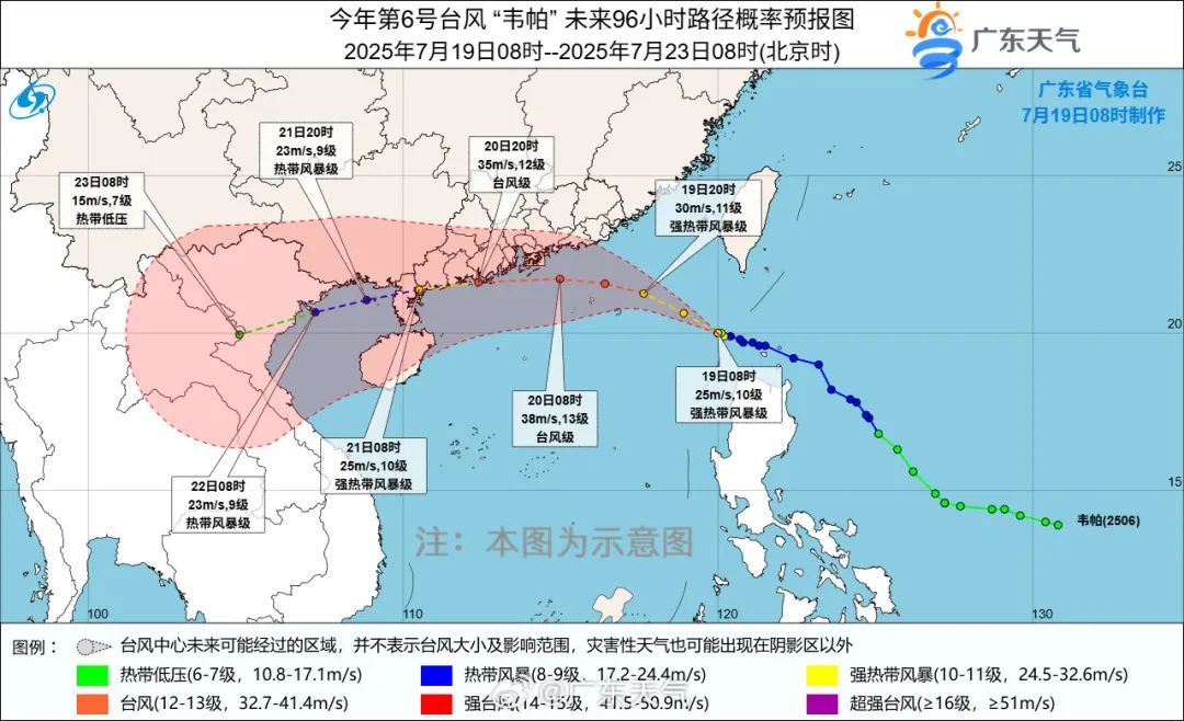 19日晚上将加强为台风级,将于20日下昼至夜间以台风或强台风级(12~14级)在深圳到湛江一带沿海登陆。