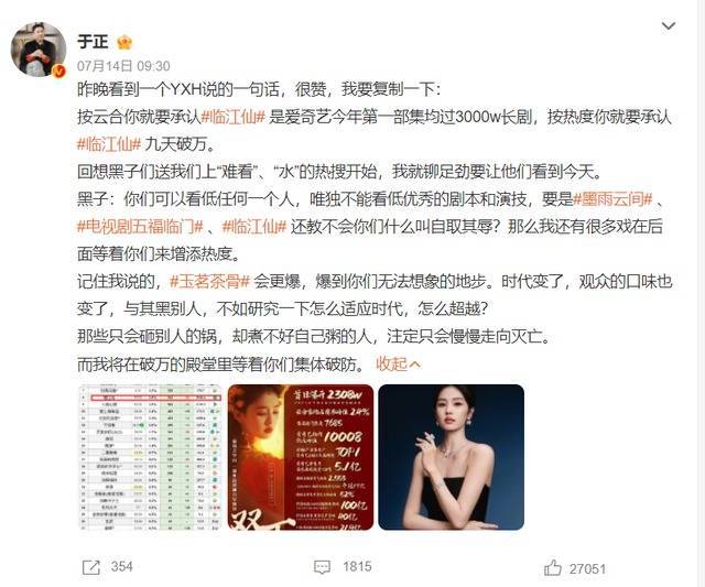 前不久,于正在我方的外交账号发言,然后“于正玉茗茶骨爆到你们无法念念象”话题就登上热搜,他让网友记着我方说的话,《玉茗茶骨》会更爆,爆到你们无法念念象的地步,期间变了,不雅众的口味也变了,与其黑别东说念主,不如接洽一下何如合适期间,何如高出?