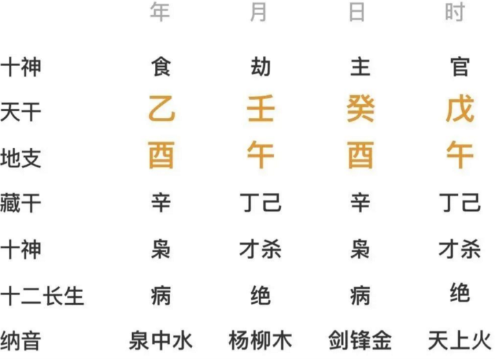 坤造:乙酉年,壬午月,癸酉日,戊午时(戌亥空)