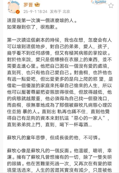 近日,罗晋倏得在微博为我方饰演的扮装发布长文谈歉。