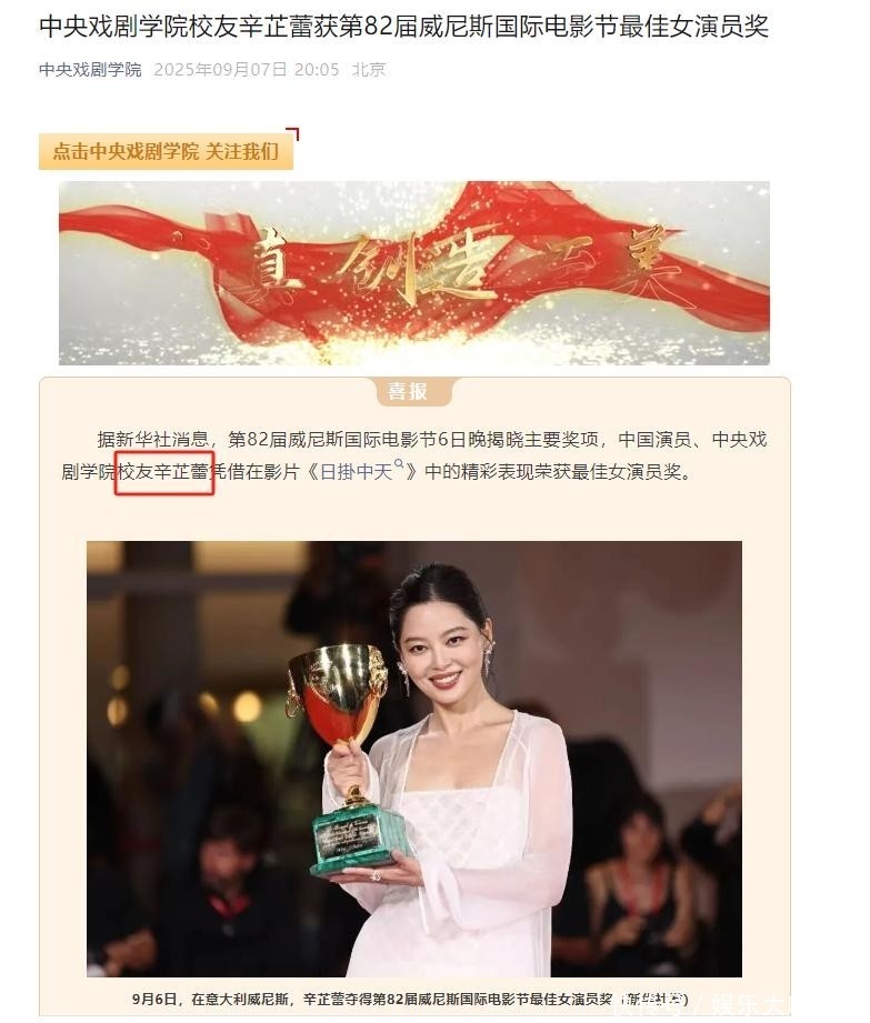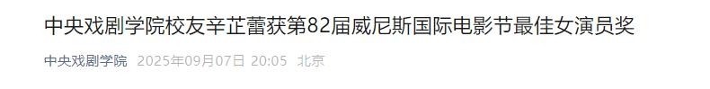 9月7日,中央戏剧学院官方微信公众号发文:“道喜我校学友辛芷蕾荣获第82届威尼斯外洋电影节最好女演员奖。”
