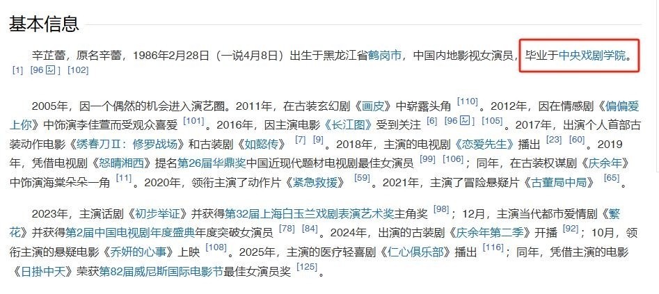 而百科词条中“毕业于中央戏剧学院”的表述,无形中误导了公众领略。