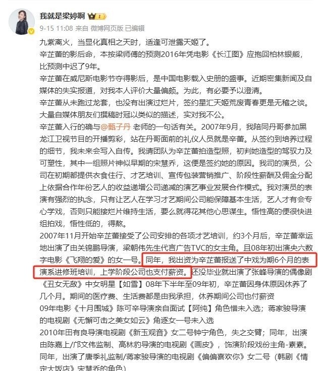 她早期牙东谈主梁婷发布长文说明:2008年曾出资安排辛芷蕾插足中央戏剧学院饰演系进修班,学制仅为六个月。
