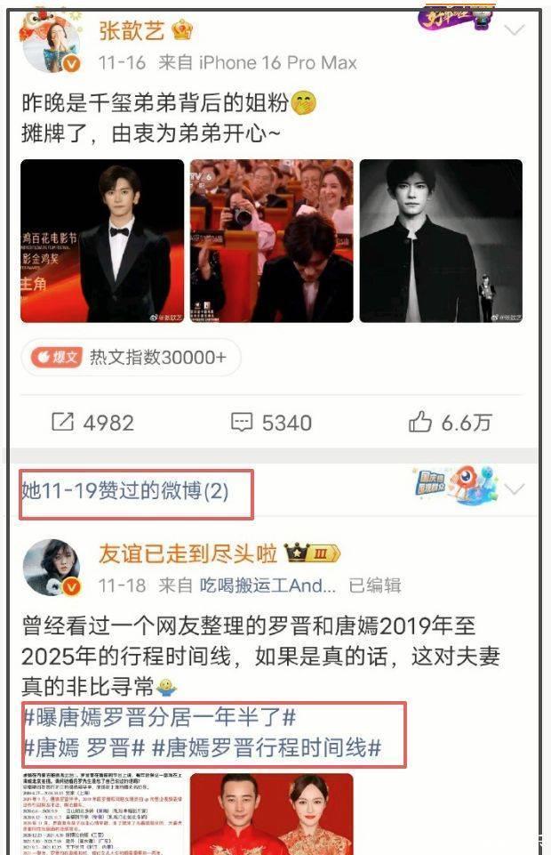本以为这些王人仅仅网友的过度猜想,没猜测网友发现演员张歆艺确切也点赞了罗晋唐嫣婚变的微博。一文娱博主晒出了唐嫣罗晋2019年至2025年的技能线,称两东说念主还是分居一年半,并称“这对夫妻非比寻常”线路两东说念主婚配生变。