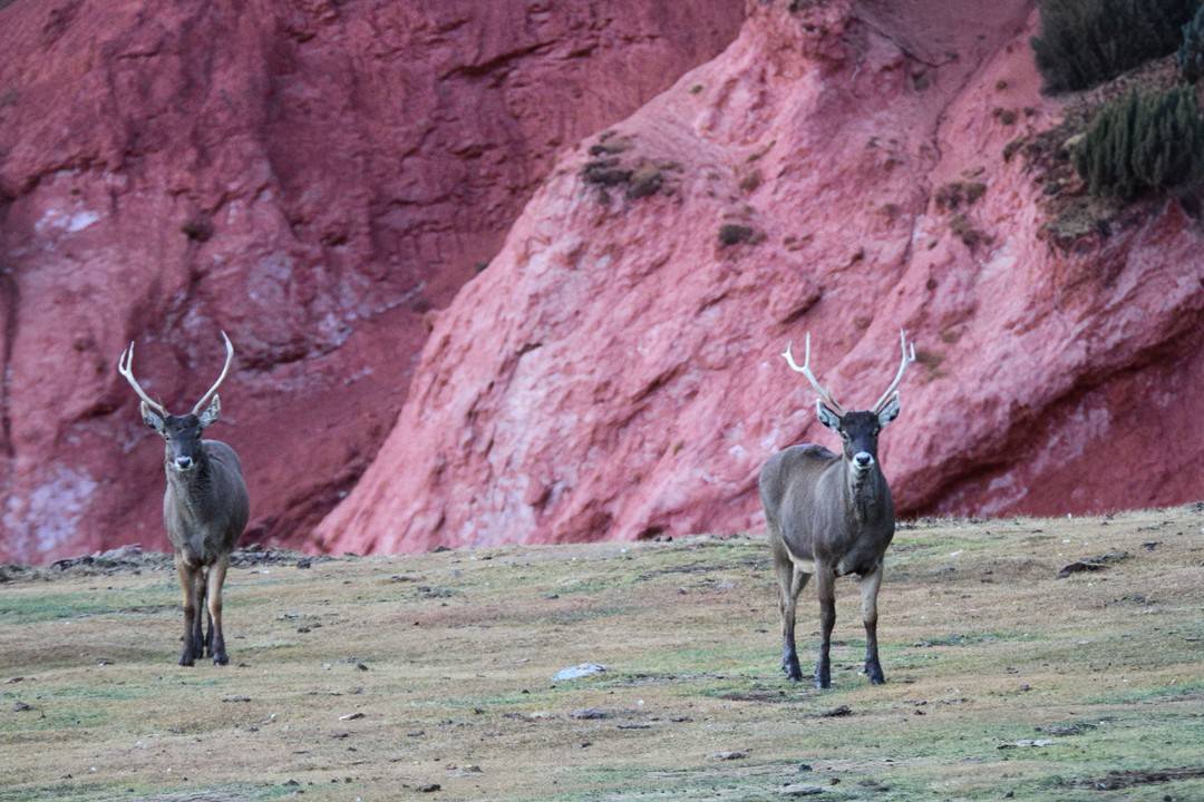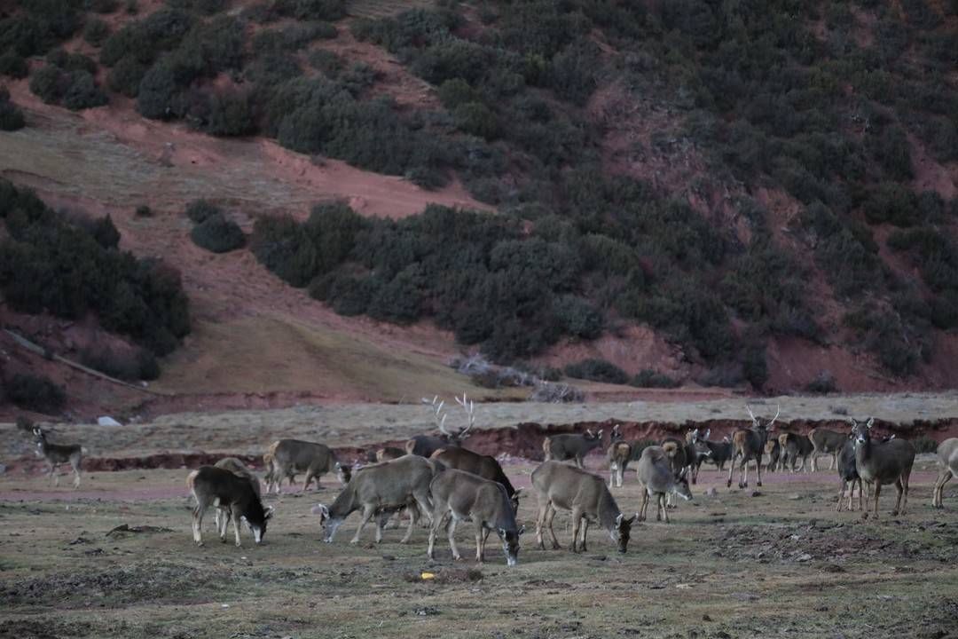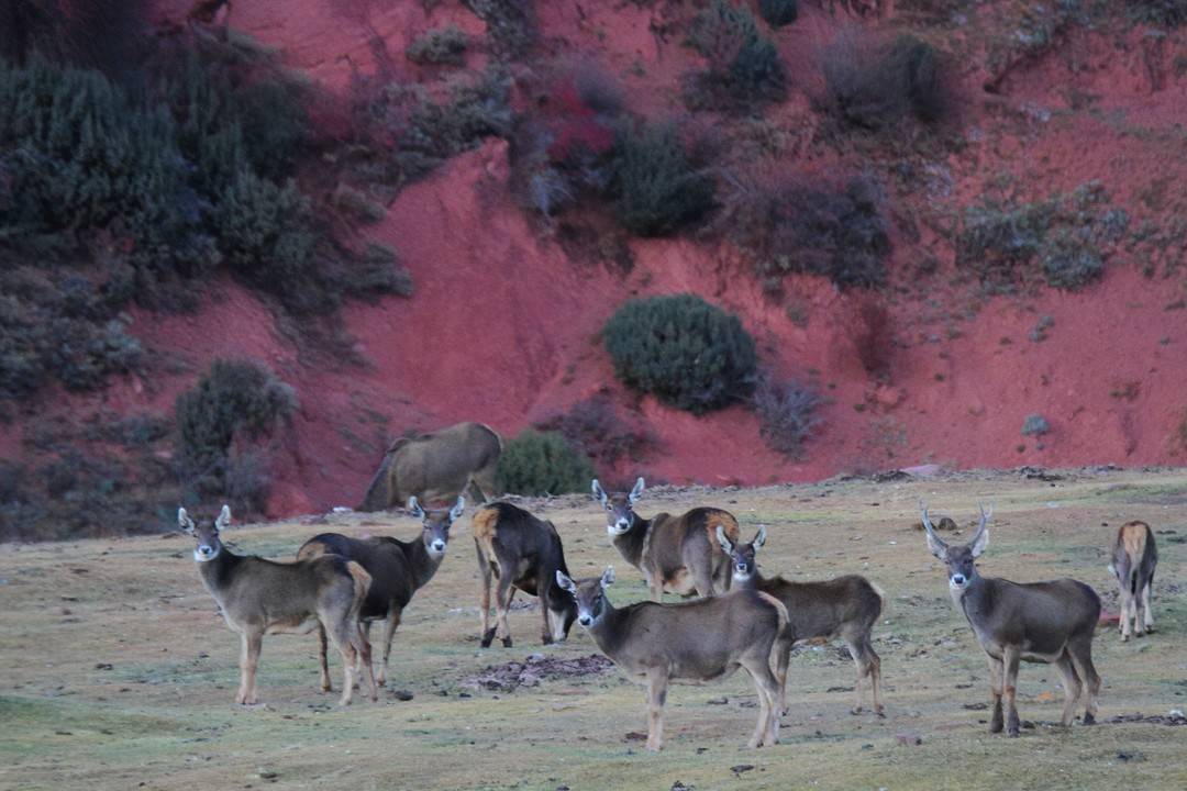 11月9号晚上6点过,龚自华在德格县玉隆乡绒青村境内,再度遭逢这一大群白唇鹿。“那时天色接近傍晚,它们正从山腰下山觅食。”龚自华说,“这片草原是夏日牧场,当今牧民迁走了,加上这里是一大片丹霞地貌,一些岩石上含有盐分,可能它们相比心爱。”