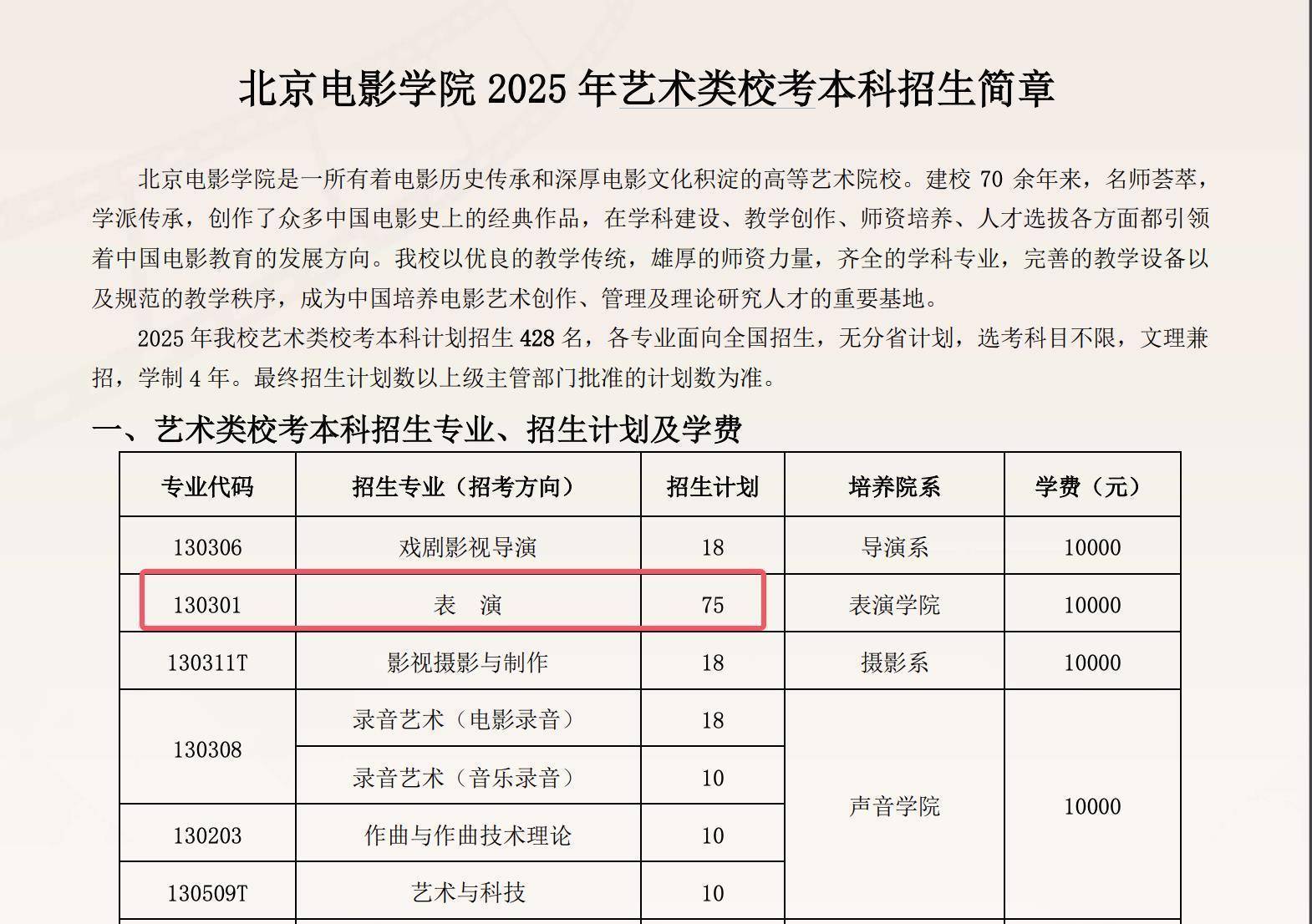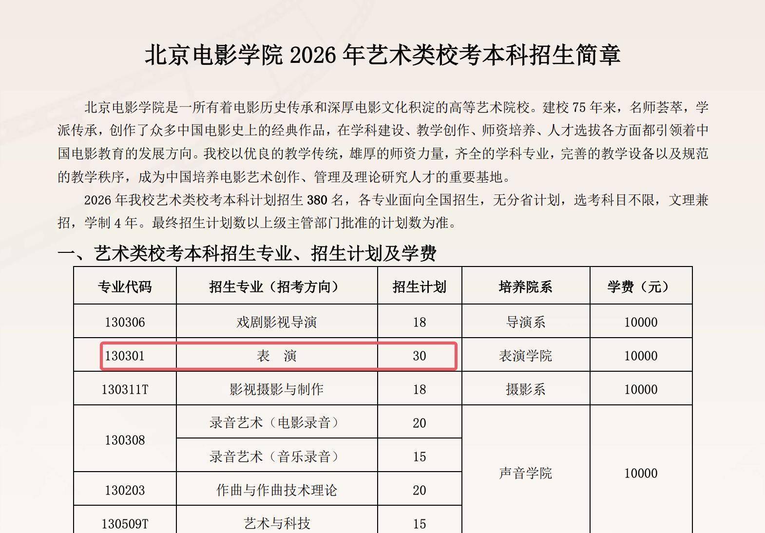 北京电影学院2026年艺术类校考本科招生简章显现,2026年该校艺术类校考本科观念招生380名,各专科面向寰宇招生,无分省观念,选考科目不限,文理兼招,学制4年。最终招生观念数以上司旁边部门批准的观念数为准。其中,扮演学院的扮演专科招生观念为30东说念主,膏火为1万元每年。
