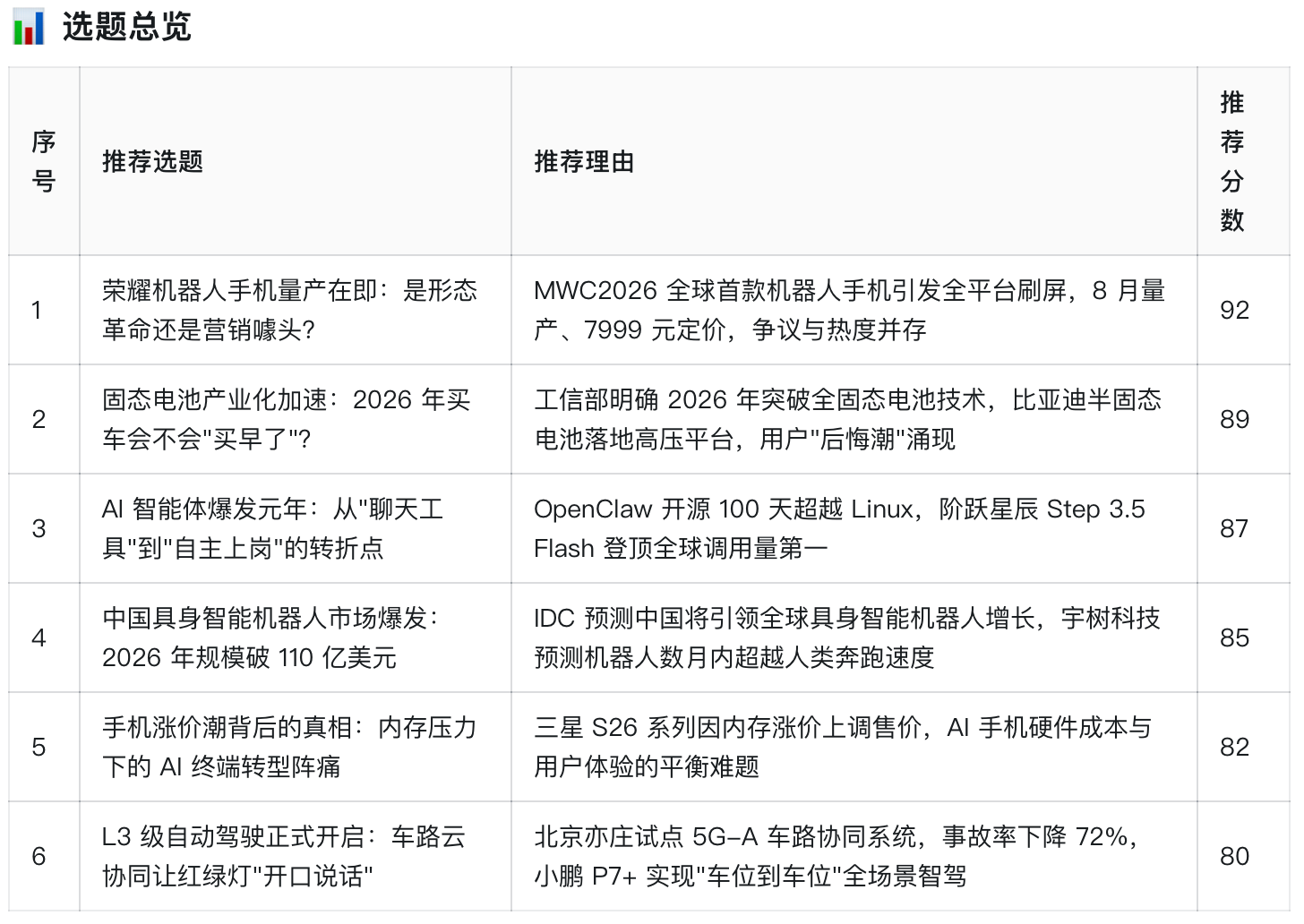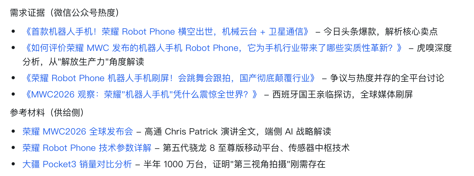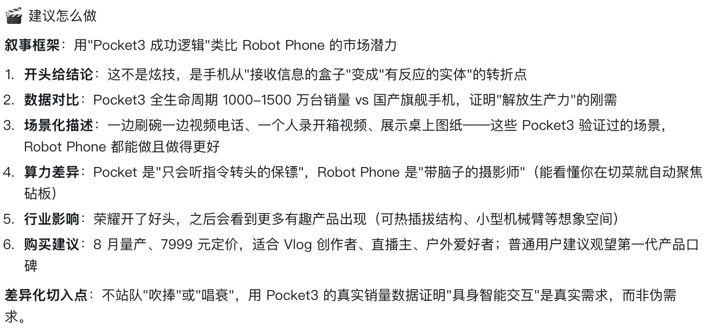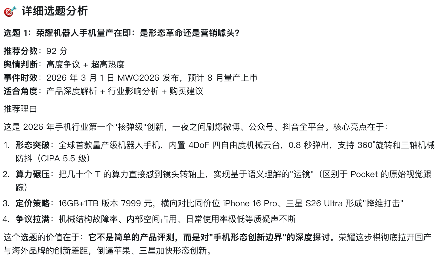 同期,悟空还会找出这个选题的中枢亮点和价值,比如荣耀机器东说念主手机这个选题,它判断这个选题的价值是拉建国产与国际品牌的改进差距,倒逼其他品牌加速格式改进。