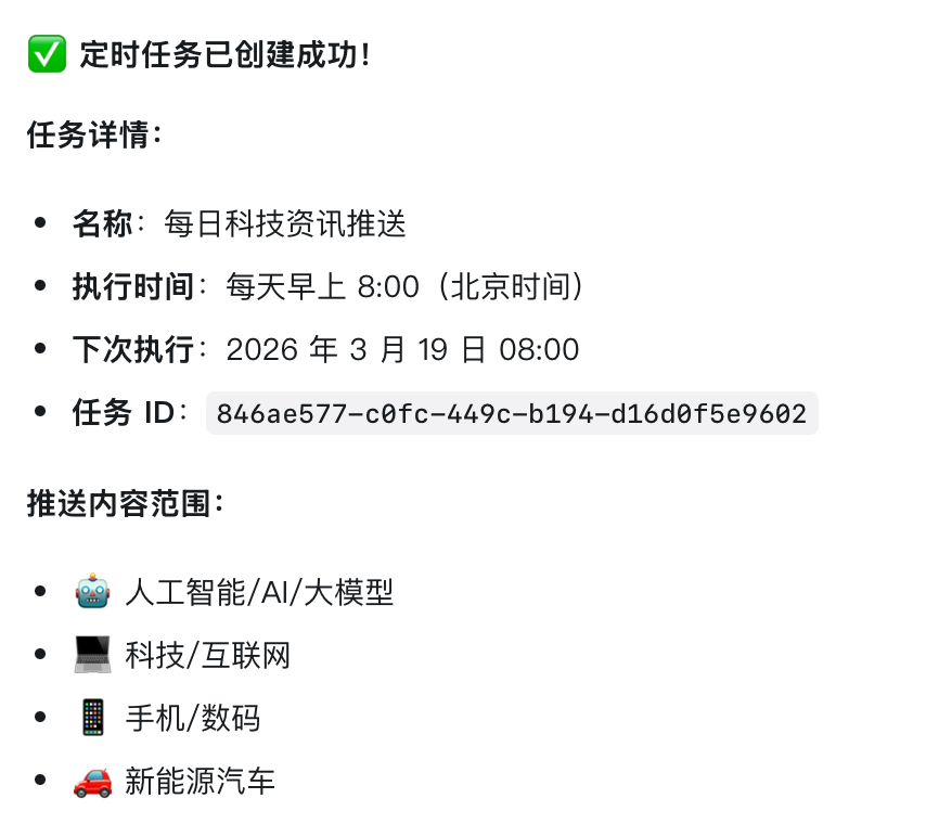 刻下在悟空上,我只需教导:"每天早上8点推送东说念主工智能、科技、手机、AI、大模子、新动力汽车界限的最新资讯摘录",系统便自动创建定时任务。